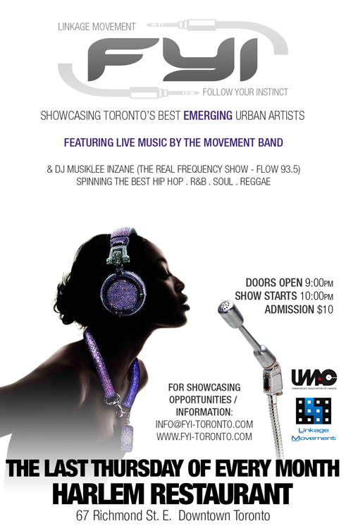 You are invited to FYI (Follow Your Instinct) on Thursday, November 25, 2010 at Harlem Restaurant, 67 Richmond St. E. Toronto. FYI will feature the best of Toronto’s emerging urban artists backed by the 4-piece “Movement Band” & Dj Musiklee Inzane from The Real Frequency Show (93.5 FM)