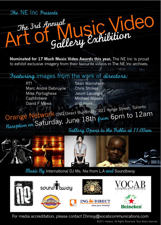 The Much Music Video Awards (MMVAs) comes at the time of year when everybody in our industry takes a breather to celebrate our genre. The NE Inc will be hosting its 3rd annual ART OF MUSIC VIDEO gallery exhibit and your boy will be in Toronto to premiere and exhibit stills from 3 brand new music videos.