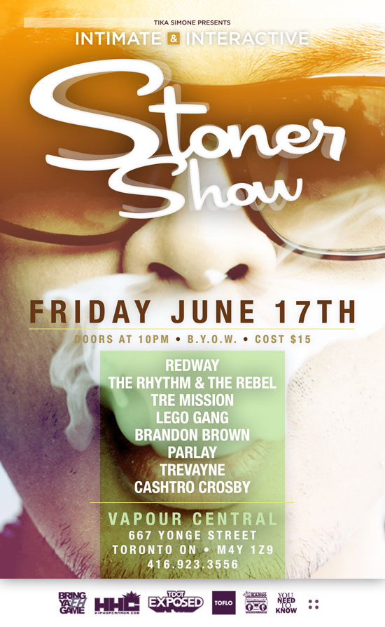 Not all of us may indulge in the ‘Almighty Green’ but with the popularity of Wiz & Snoop and many more artists, I thought that we were missing something. I found very many underground successes in and around Toronto that do music and enjoy laying back on Cloud 10. LOL…This is definitely going to be an interesting show. Spread the word for me please. This will be one of the last 3 Intimate & Interactive’s I do before I head off to NYC.