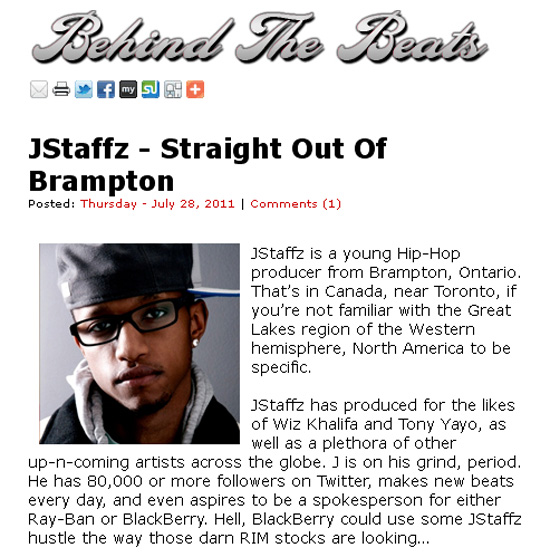 JStaffz has produced for the likes of Wiz Khalifa and Tony Yayo, as well as a plethora of other up-n-coming artists across the globe. J is on his grind, period. He has 80,000 or more followers on Twitter, makes new beats every day, and even aspires to be a spokesperson for either Ray-Ban or BlackBerry. Hell, BlackBerry could use some JStaffz hustle the way those darn RIM stocks are looking…