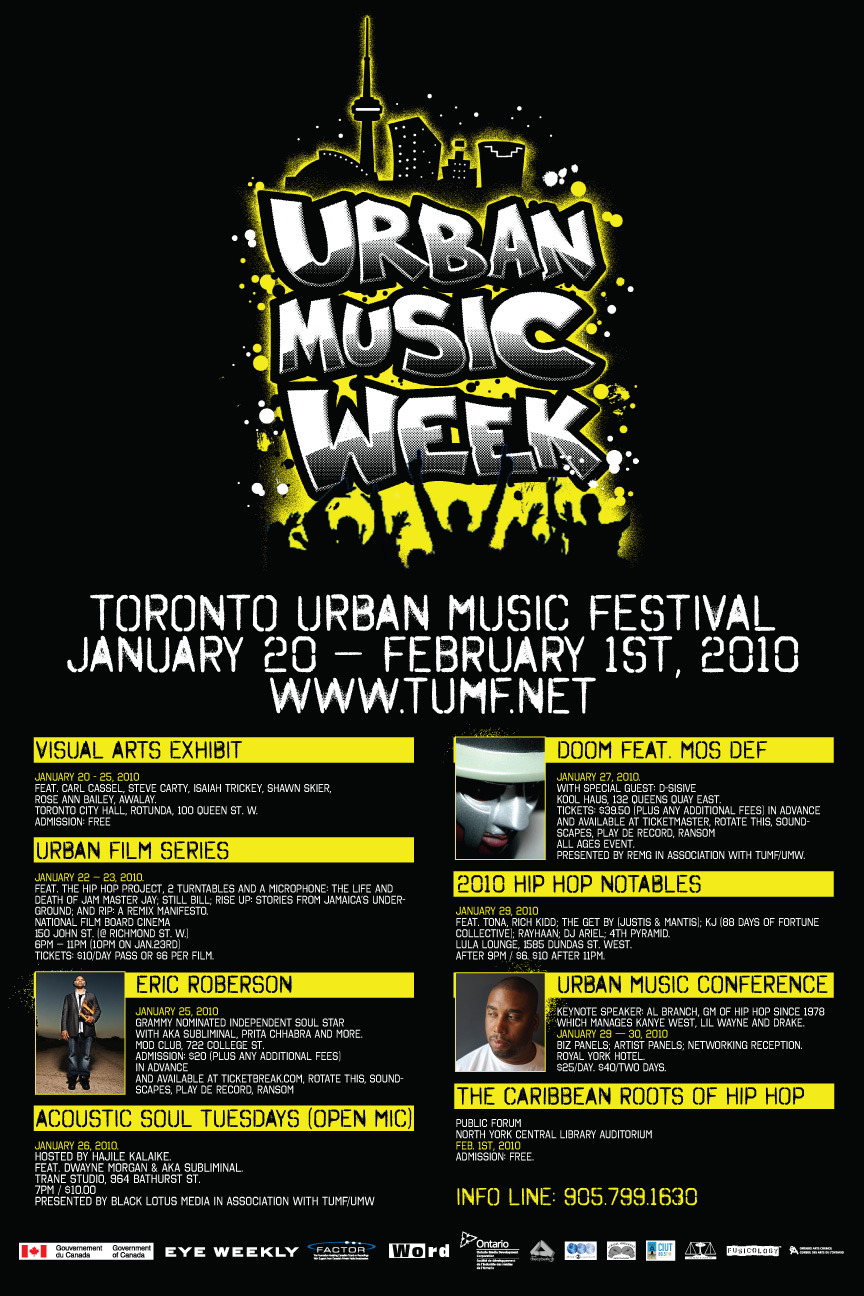 The Toronto Urban Music Festival (TUMF) has created Urban Music Week, celebrating Urban Music, Urban Arts and Urban Music Industry Conference.