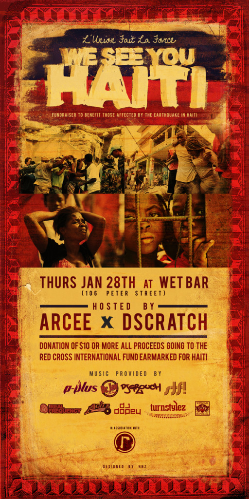 One of many charitable fundraising events put together to help Haiti. Tonight (Thursday January 28th) @ Wet Bar (106 Peter Street).