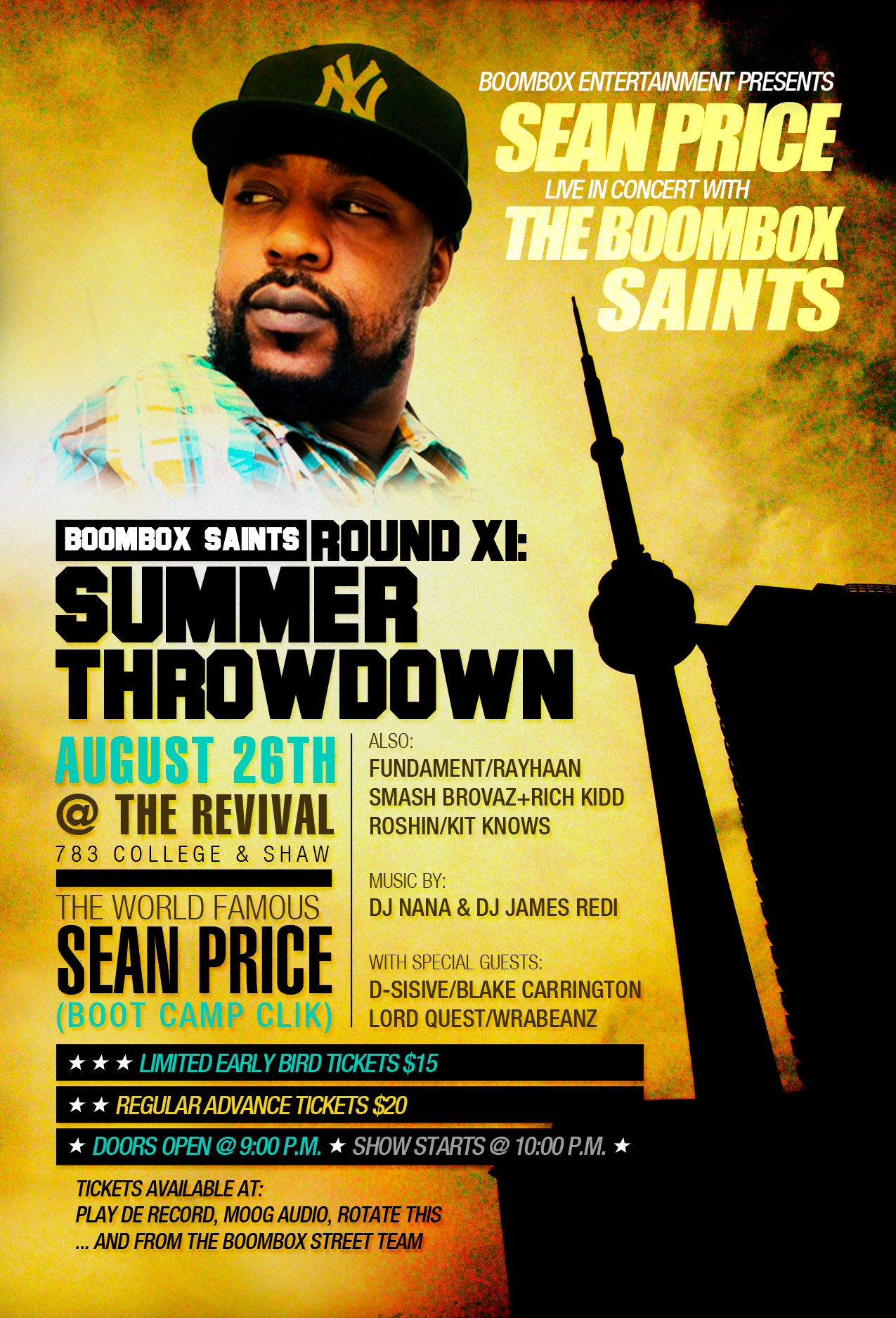 For the 11th installment of their concert series the Boombox Saints crew presents BCC representative Sean Price along with a crazy lineup of local emcees: Fundament, Kit Knows, Rayhaan, Smash Brovaz, Rich Kidd, Blake Carrington, D-sisive, Lord Quest, Rayhaan, Roshin (Notes to Self), WrabeanZ.