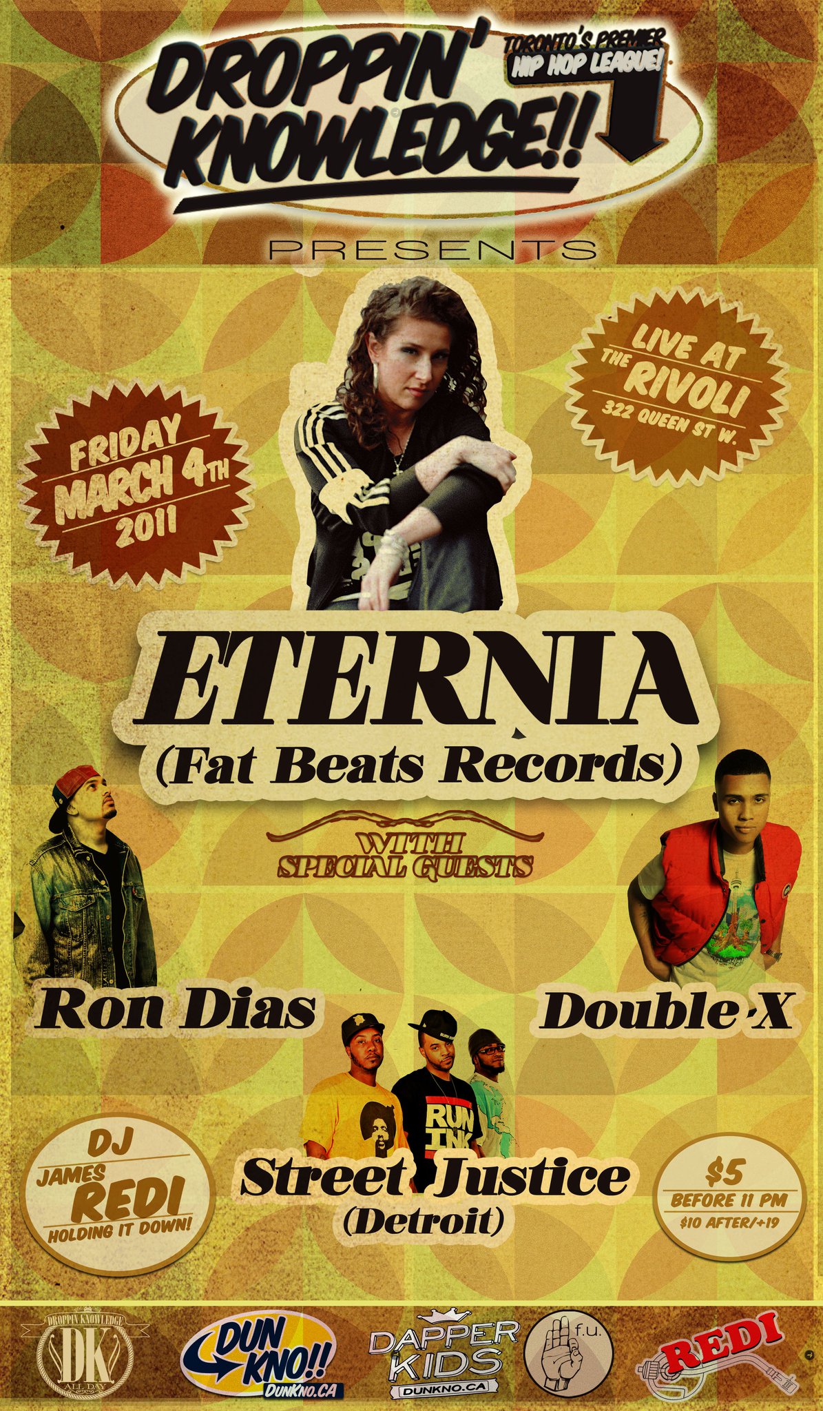 EVENT: Droppin' Knowledge!! presents Eternia with Ron Dias, Double X & Street Justice (Friday March 4th, @ The Rivoli)