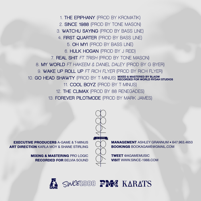 A-Game let off their “Since 1988” project, with appearances from Trish, Daniel Daley, Hakeem and Rich Flyer plus production from Bassline, Kromatik, J Reid, 88 Renegades, Mark James and Grammy-nominated producers, T-Minus and Tone Mason.