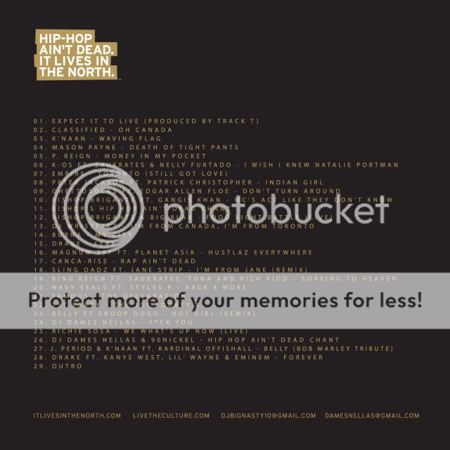 Tape is mixed by DJ Big Nasty & DJ Dames Nellas and includes music from k-os, Empire, Drake, King Reign, Famous, Bishop, 1st Party, Classified, Richie Sosa, Magnum 357 & more! Full tracklist after the jump!